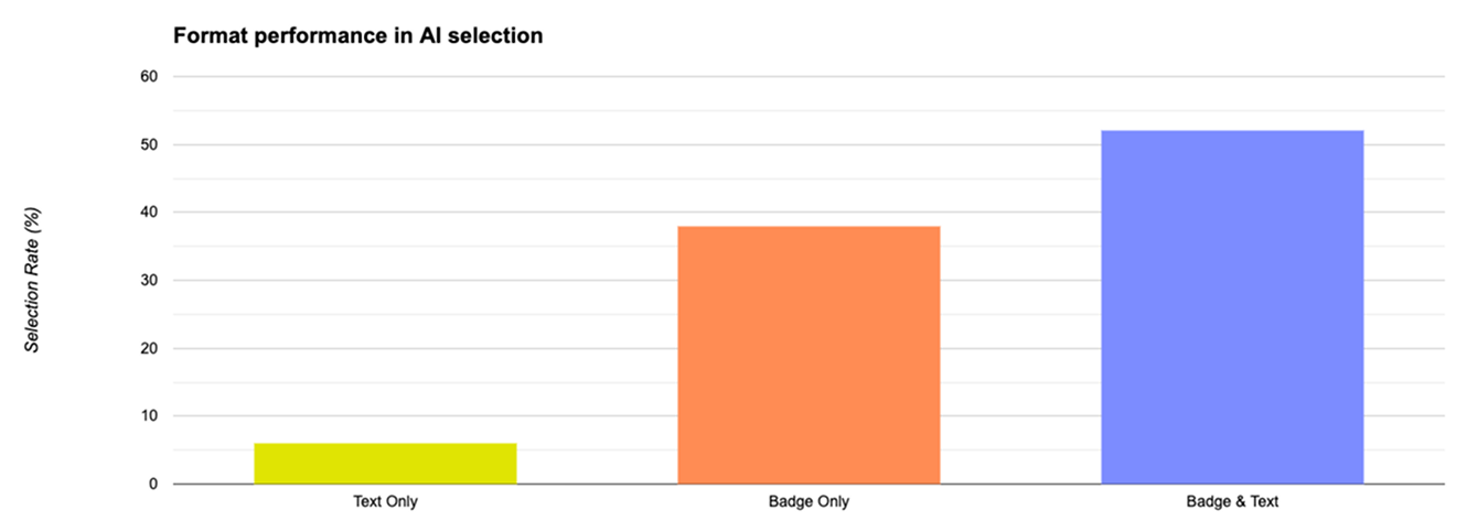 Products with verified badges and endorsements were selected up to 259% more often than random chance, while unverified products were almost completely ignored. Named authorities like Ulta Conscious Beauty, MADE SAFE, and EWG dramatically outperformed generic claims. Pairing badges with optimized text increased selection rates sevenfold.