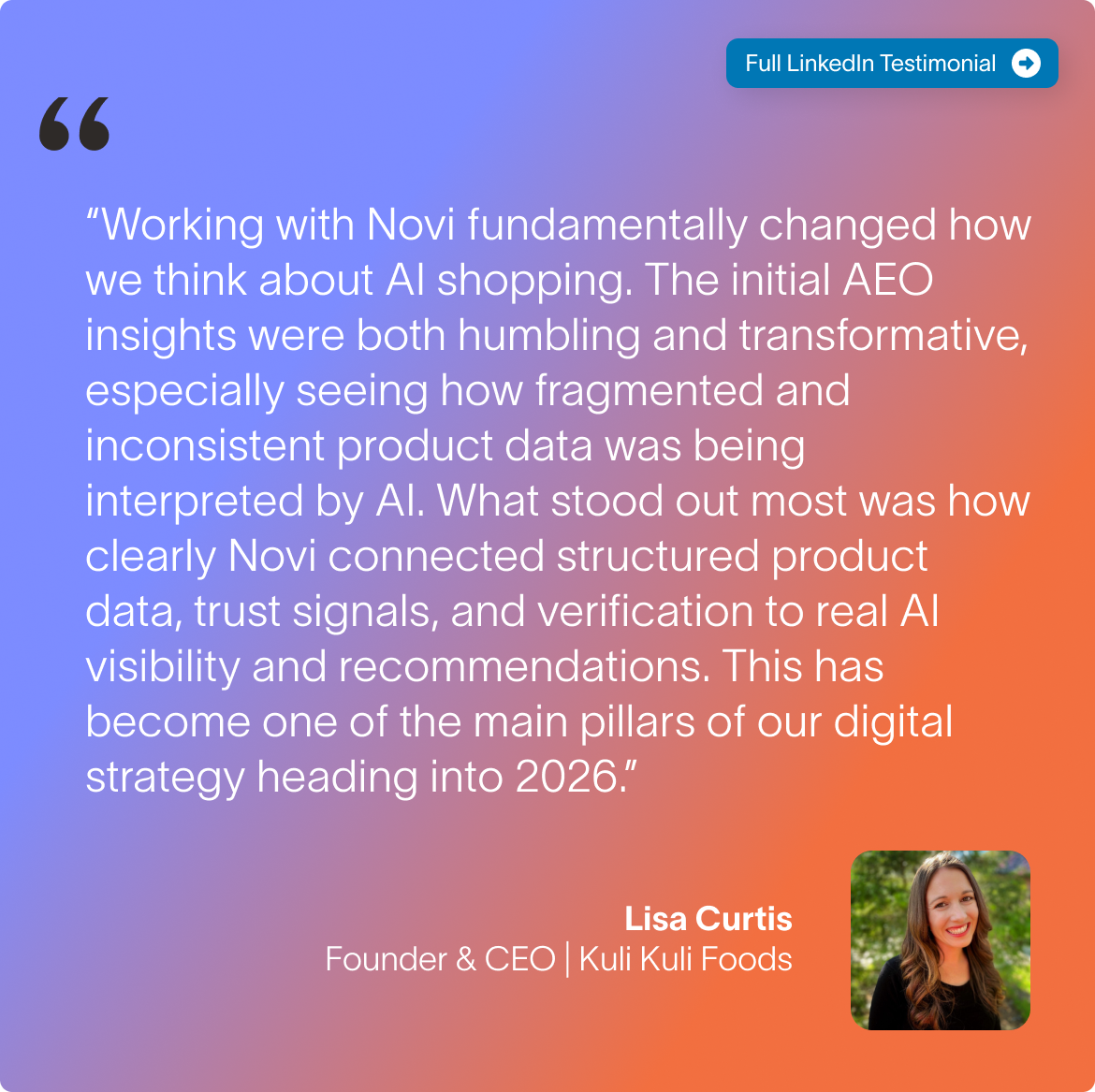 A: From small brands to major, global enterprises, users leverage Novi to verify product claims, increase customer discoverability in AI Shopping, and unlock more growth opportunities.